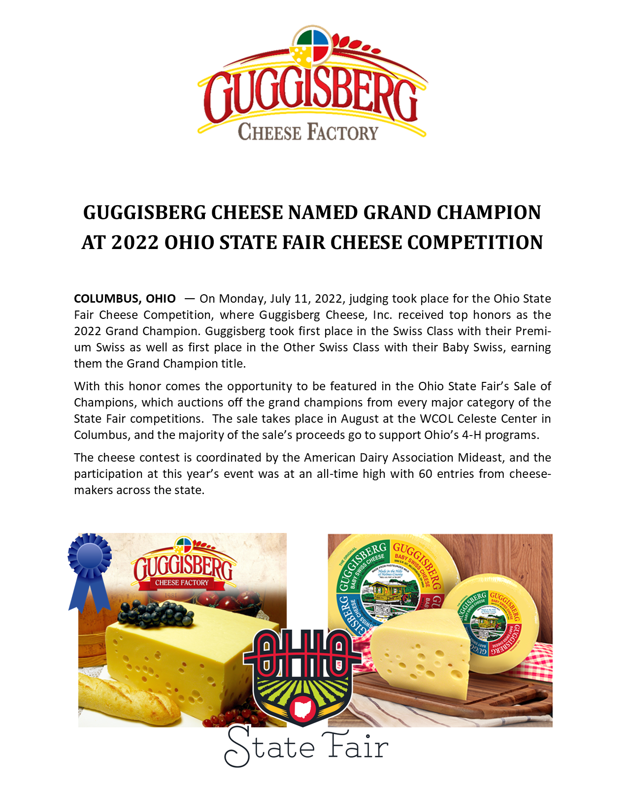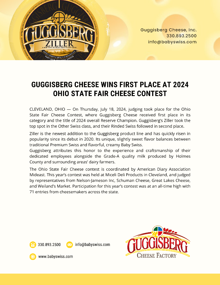 Guggisberg Cheese was named the first-place winner of the first contest, the Ohio Swiss Cheese Association’s Dairy Month Contest, and received second place at the 2018 Ohio State Fair contest. Guggisberg is also the reigning United States Swiss Champion.