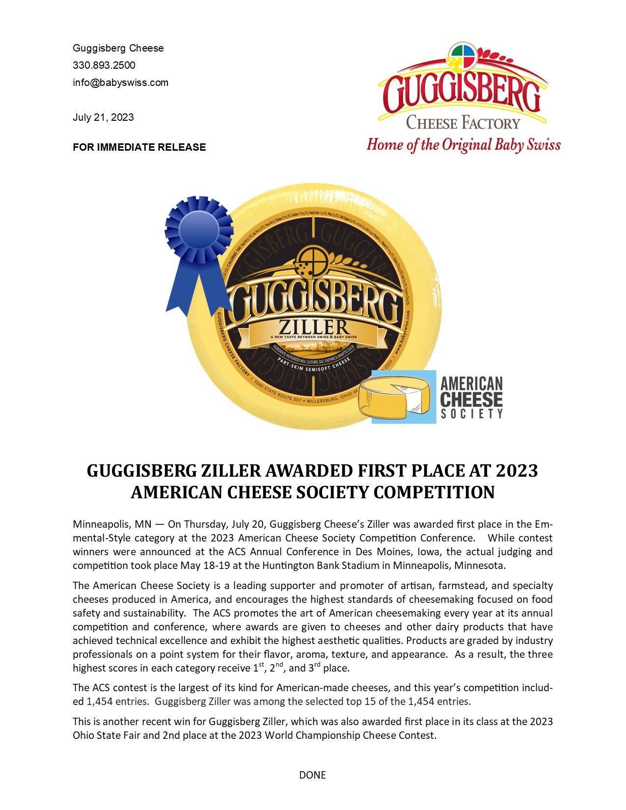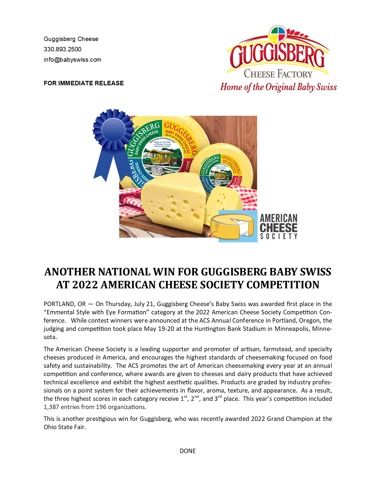 GUGGISBERG TAKES TOP 3 SPOTS AT AMERICAN CHEESE SOCIETY CONTEST