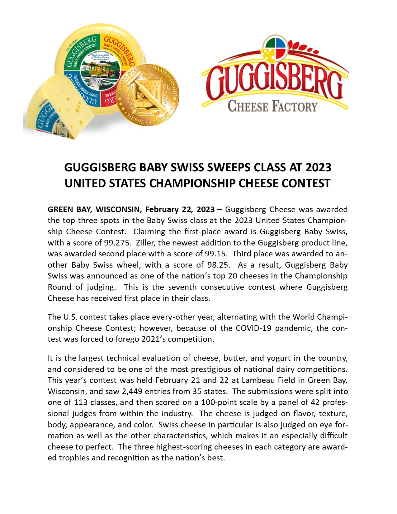 GUGGISBERG TAKES THE TOP FOUR SPOTS OF U.S. CHAMPIONSHIP CHEESE CONTEST
